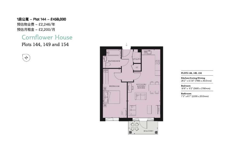 1房公寓 | £459,000 | £2,200/月 | £2,246/年 |